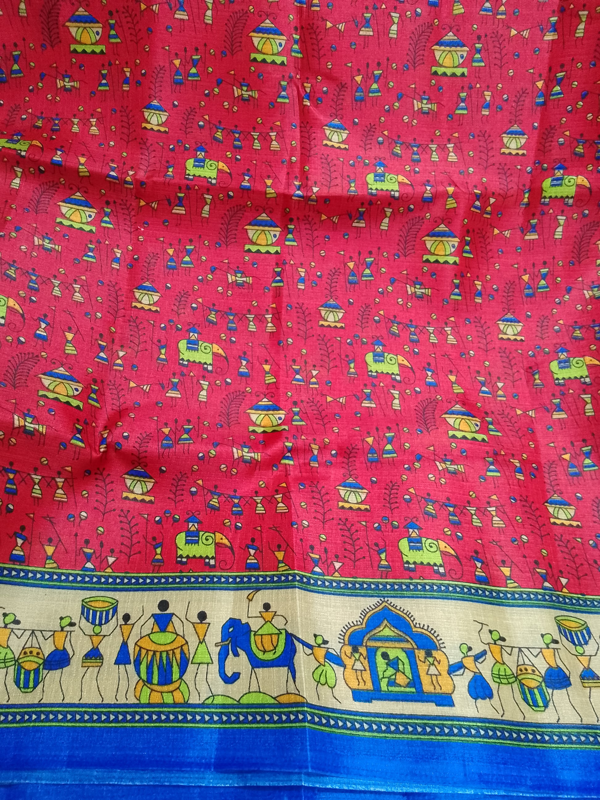 Semi Silk saree with Indian designer border, designer pallu, and running blouse. Red saree with blue border. Modern Worli art design throughout saree and pallu.